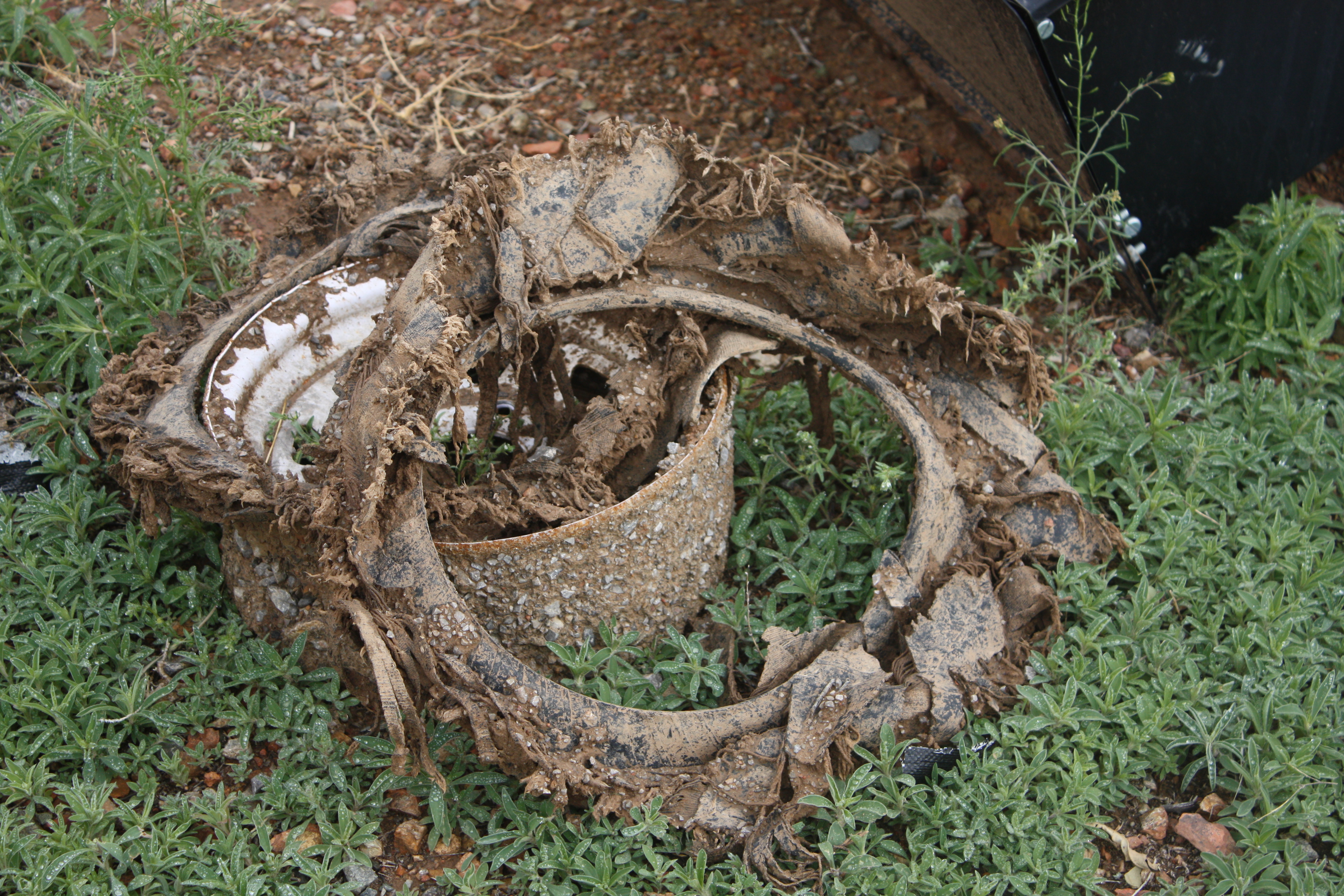 Not so much this time. This time that tire tread blew high, wide, and handsome, winding around the tire and crumpling the trailer fender. Backing and turning became nigh on impossible. It was raining…again…and the driveway was turning into a mud pit.