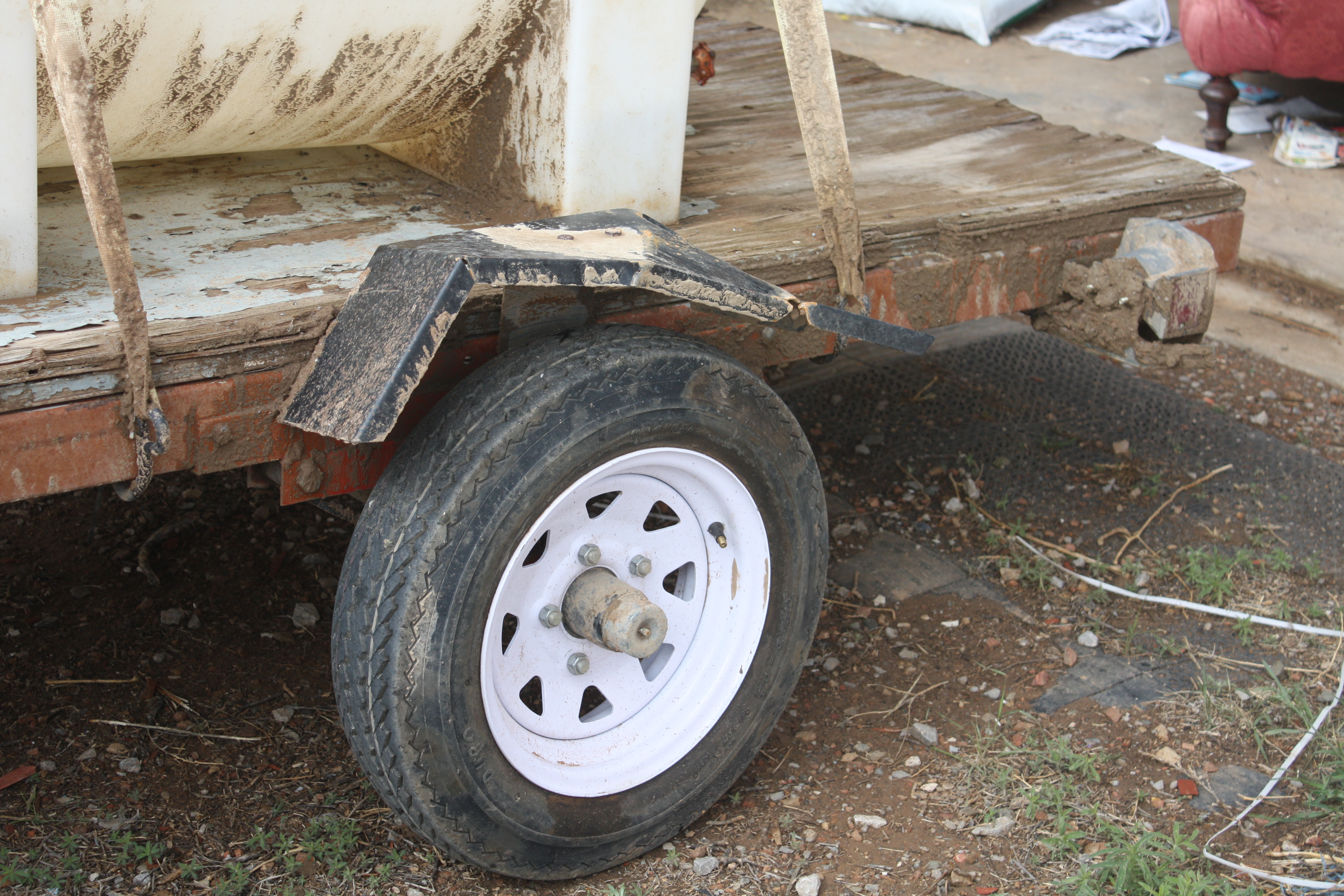 The next day I found my spare tire, and consented to let them change tires even though I’ve done so in the past (by myself!). We agreed to get together when we were all back from shopping. Except I returned to find the trailer tire replaced, fender straight, and the trailer pushed out of the road into the yard.