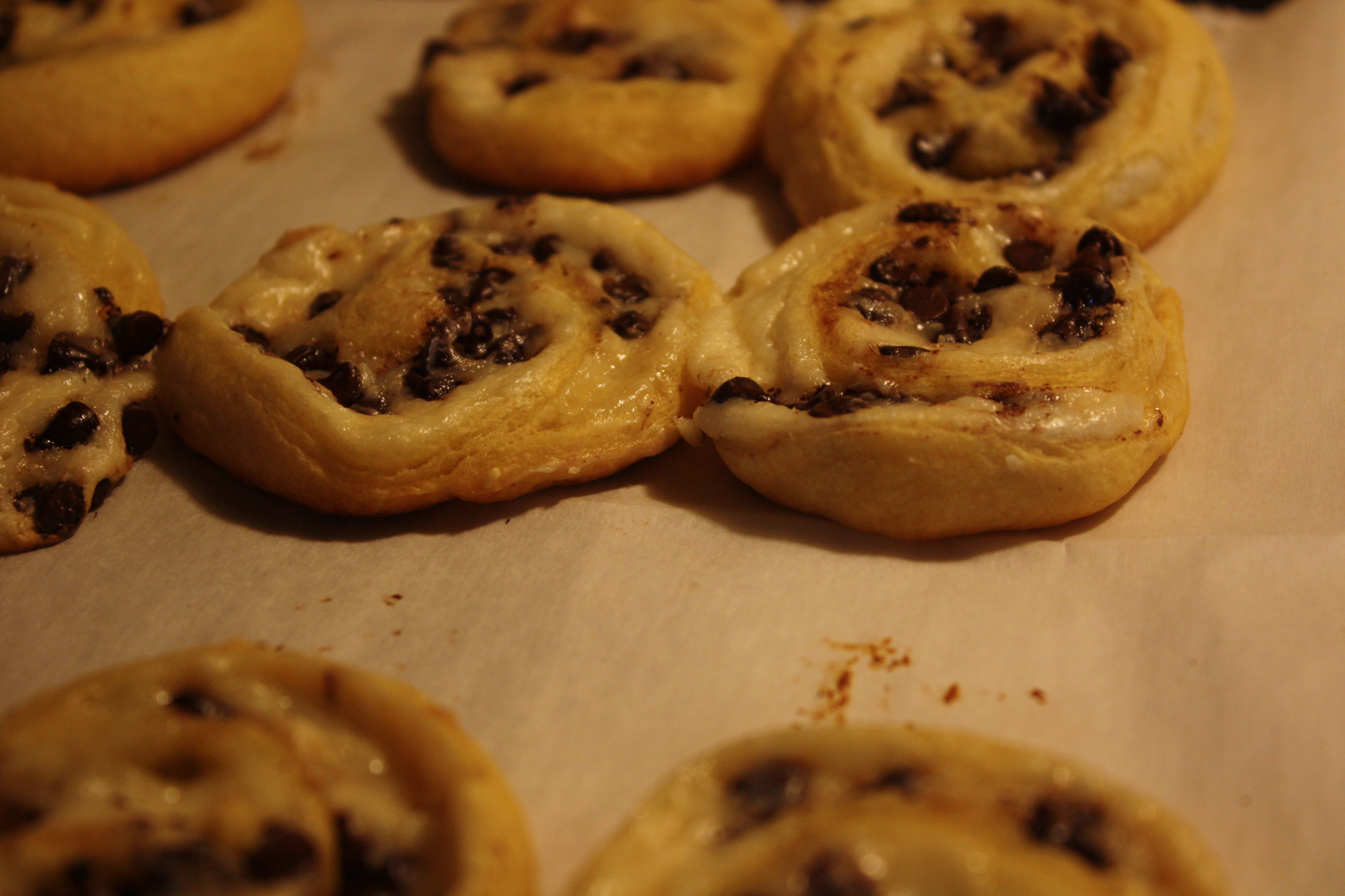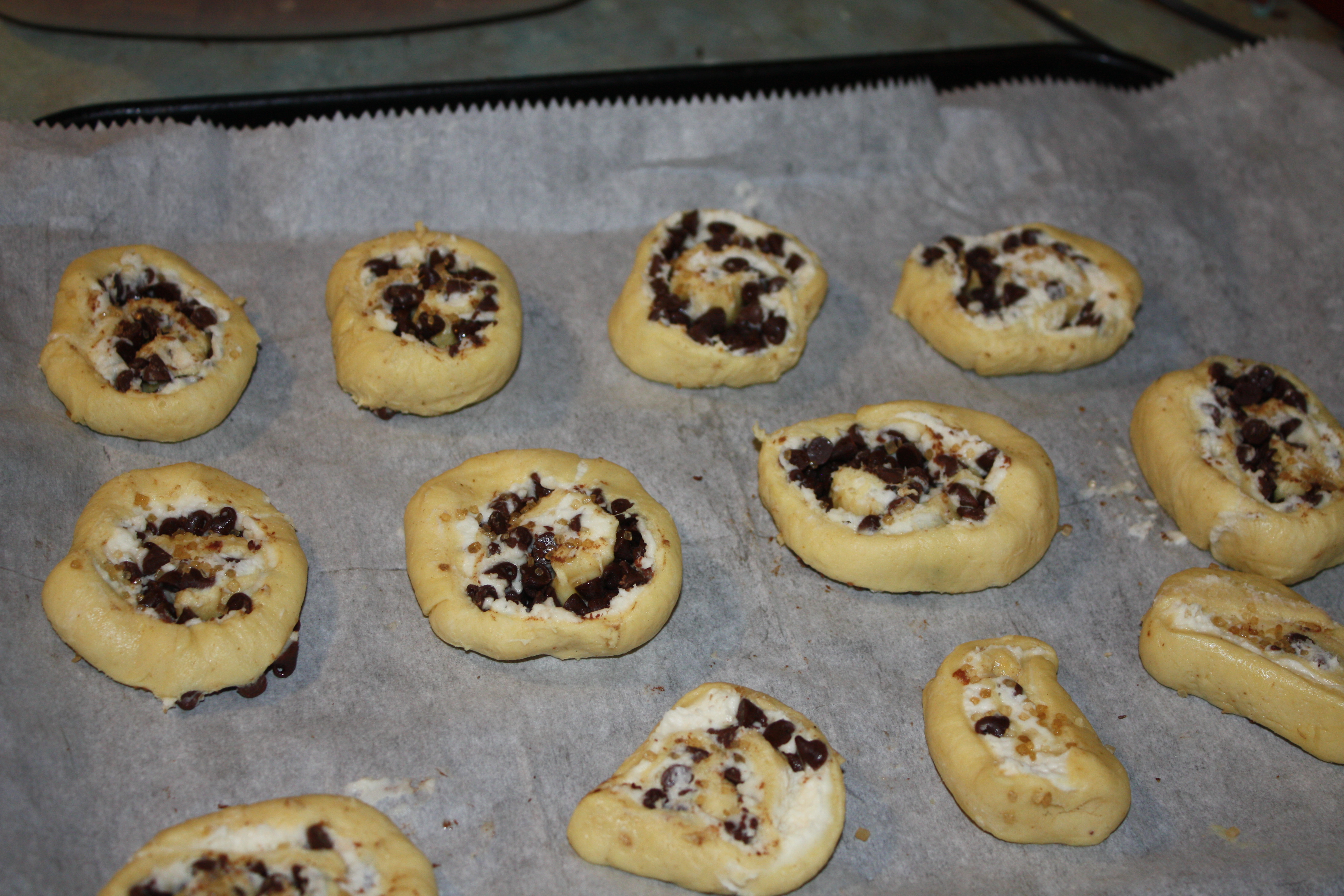 nice and flat. Spread the cream cheese mix on the flattened dough, sprinkle on chocolate chips. Here I deviated by using a full cup of mini chips.